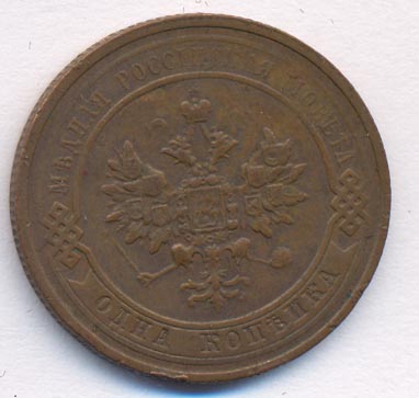 Лицевая сторона — двуглавый орел, надпись МЕДНАЯ РОССIЙСКАЯ МОНЕТА и обозначение номинала (одна копейка); оборотная — обозначение номинала (1 копейка) в бусовом ободке и дата. Нормативный вес — 3,28 грамма, гурт рубчатый.