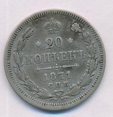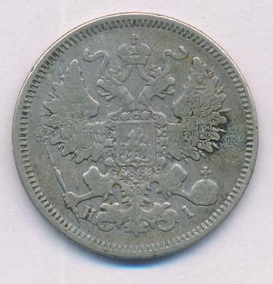 Лицевая сторона — гербовый орел, оборотная —обозначение номинала (20 копеекъ), окруженное венком из лавровой и дубовой ветвей и дата.