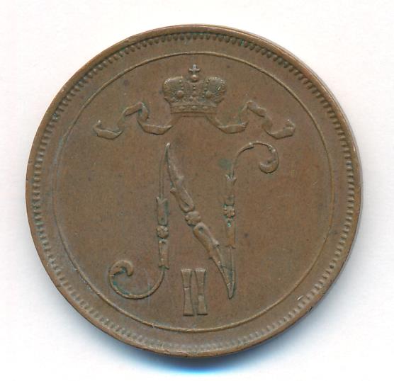 Лицевая сторона — вензель Александра II, оборотная — номинал (10 PENNIA) в венке из дубовых ветвей и дата. Нормативный вес — 12,80 грамма, гурт гладкий.