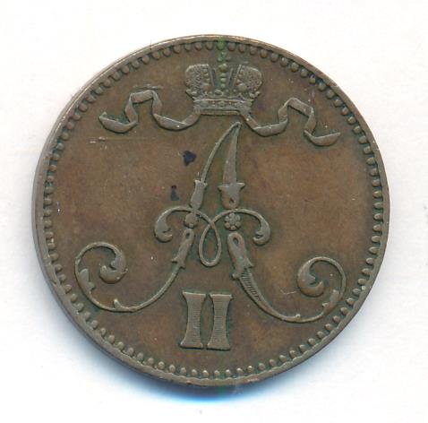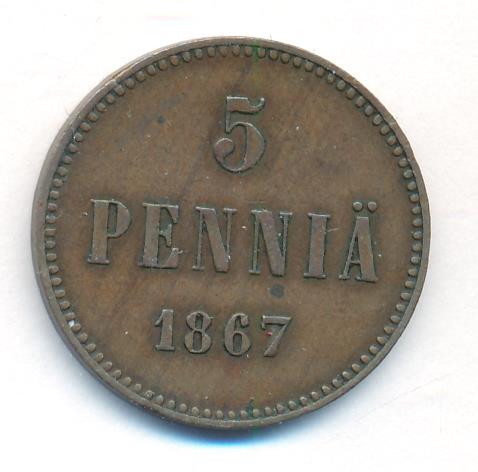 Лицевая сторона — вензель Александра II, оборотная — номинал (5 PENNIA) и дата. Нормативный вес — 6,40 грамма, гурт гладкий.