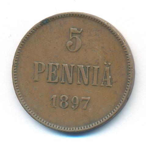 Лицевая сторона — вензель Александра II, оборотная — номинал (5 PENNIA) и дата. Нормативный вес — 6,40 грамма, гурт гладкий.