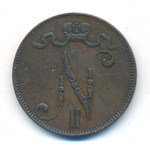 Лицевая сторона — вензель Александра II, оборотная — номинал (5 PENNIA) и дата. Нормативный вес — 6,40 грамма, гурт гладкий.