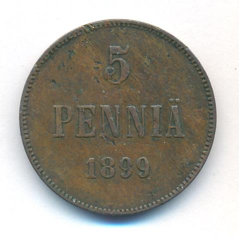 Лицевая сторона — вензель Александра II, оборотная — номинал (5 PENNIA) и дата. Нормативный вес — 6,40 грамма, гурт гладкий.