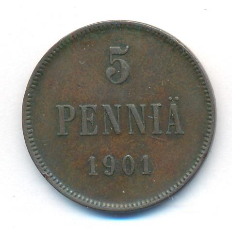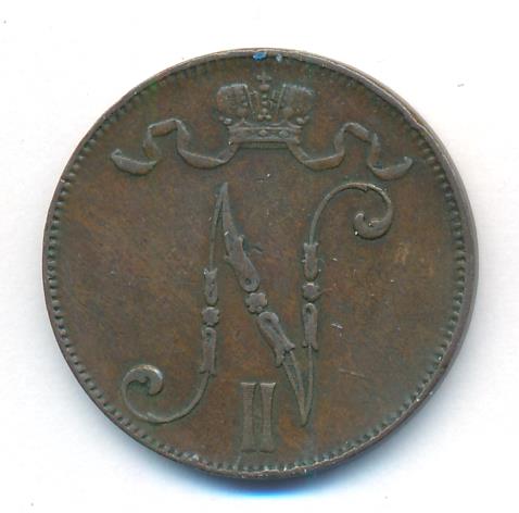 Лицевая сторона — вензель Александра II, оборотная — номинал (5 PENNIA) и дата. Нормативный вес — 6,40 грамма, гурт гладкий.