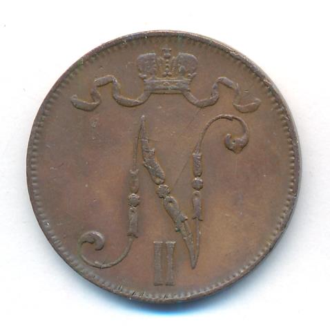Лицевая сторона — вензель Александра II, оборотная — номинал (5 PENNIA) и дата. Нормативный вес — 6,40 грамма, гурт гладкий.