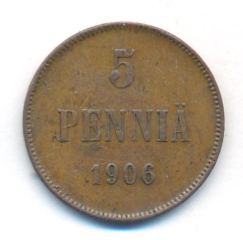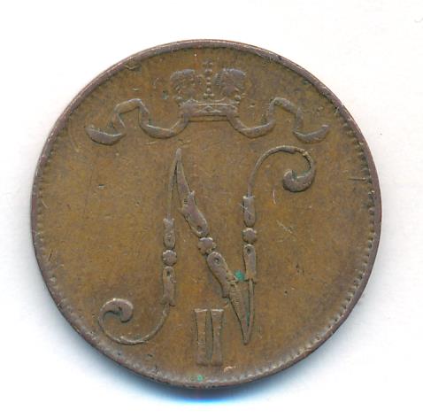 Лицевая сторона — вензель Александра II, оборотная — номинал (5 PENNIA) и дата. Нормативный вес — 6,40 грамма, гурт гладкий.