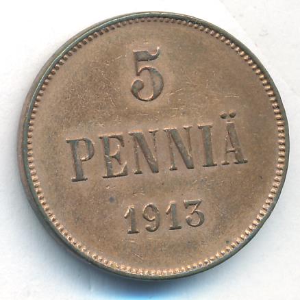 Лицевая сторона — вензель Александра II, оборотная — номинал (5 PENNIA) и дата. Нормативный вес — 6,40 грамма, гурт гладкий.