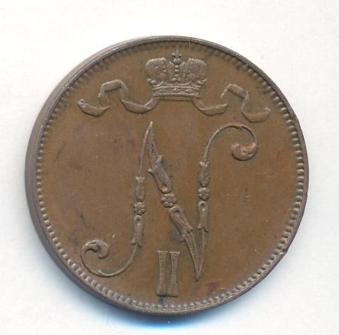 Лицевая сторона — вензель Александра II, оборотная — номинал (5 PENNIA) и дата. Нормативный вес — 6,40 грамма, гурт гладкий.