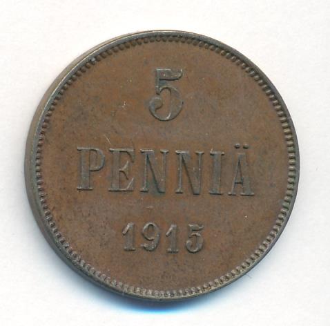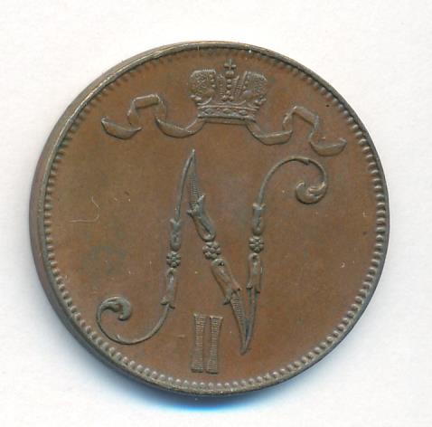 Лицевая сторона — вензель Александра II, оборотная — номинал (5 PENNIA) и дата. Нормативный вес — 6,40 грамма, гурт гладкий.