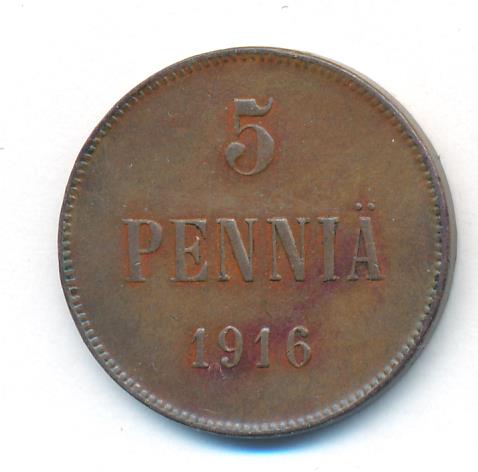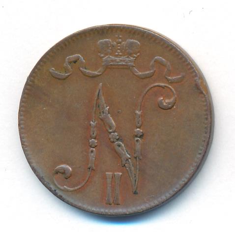 Лицевая сторона — вензель Александра II, оборотная — номинал (5 PENNIA) и дата. Нормативный вес — 6,40 грамма, гурт гладкий.