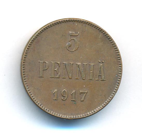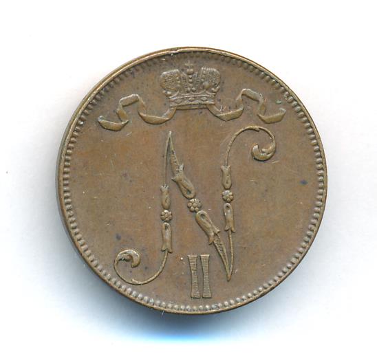 Лицевая сторона — вензель Александра II, оборотная — номинал (5 PENNIA) и дата. Нормативный вес — 6,40 грамма, гурт гладкий.