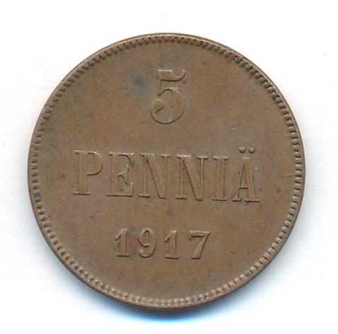 Лицевая сторона — вензель Александра II, оборотная — номинал (5 PENNIA) и дата. Нормативный вес — 6,40 грамма, гурт гладкий.