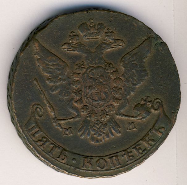 Лицевая сторона — двуглавый орел (выделяют 17 типов орла) и обозначение номинала (пять копеекъ), оборотная — вензель Екатерины II и дата. Нормативный вес — 51,19 грамма, гурт — сетка или шнур.