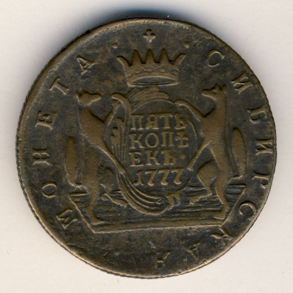 Лицевая сторона - два соболя поддерживают щит с обозначением номинала (пять копеекъ) под короной, надпись «СИБИРСКАЯ МОНЕТА». Оборотная — вензель Екатерины II в венке из пальмовой и лавровой ветвей. Гурт — надпись «колыванская медь» или шнур. Вес — 32,76 грамма.