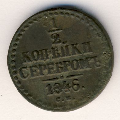 На новых монетах равенство серебряному курсу указано прямо в номинале: «1/2 КОПЕЙКИ СЕРЕБРОМ». Указ об их выпуске следует 6 сентября 1840 года («О новой медной монете на серебро 16-рублевого в пуде достоинства»). Массовая чеканка началось за год до этого на Екатеринбургском (знак ЕМ) и Сузунском (знак СМ) дворах. В качестве временной меры в 1840-1843 годах к ним подключается Ижорский завод (знак СПМ). С 1844 года после «значительного скопления медной монеты в народном обращении» в Екатеринбурге производство прекращается, а в Сузуне сокращается. Варшавский двор (знак MW), получив разрешение на выпуск общегосударственной монеты, успел отчеканить ее лишь в небольшом количестве в 1848 году.