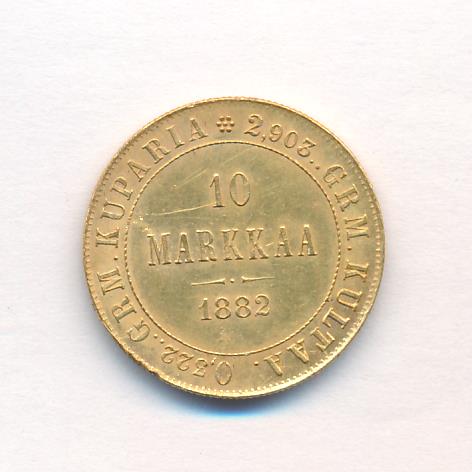 Лицевая сторона — российский двуглавый орел с гербом Великого княжества Финляндского на груди, оборотная — номинал и дата в кольцевой надписи с указанием содержания чистого золота и меди в граммах. Проба — 900, нормативный вес — 3,23 грамма, гурт ребристый.