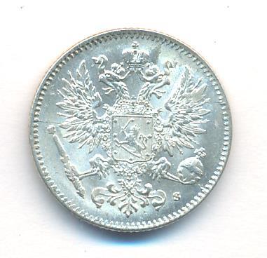 Лицевая сторона — российский двуглавый орел с гербом Великого княжества Финляндского на груди, оборотная — номинал и дата в венке из дубовых листьев. Проба — 750, нормативный вес — 2,55 грамма, гурт рубчатый.