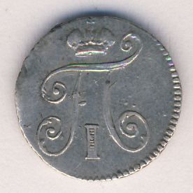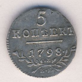 Лицевая сторона - вензель Павла I под короной, оборотная - обозначение номинала (5 копеекъ) и дата. Проба — 868, нормативный вес — 1,46 грамма, гурт — шнур.