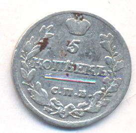 Лицевая сторона - двуглавый орел и дата, оборотная — обозначение номинала (5 копеекъ) в венке из лавровой и дубовой ветвей. Проба до 1813 года — 750, нормативный вес — 1,2 грамма; после 1813 года — проба 868, нормативный вес — 1,04 грамма.