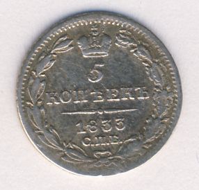 Лицевая сторона — новый гербовый орел с поднятыми крыльями, оборотная —обозначение номинала (5 копеекъ), окруженное венком из лавровой и дубовой ветвей и дата. Проба — 868, нормативный вес — 1,04 грамма.