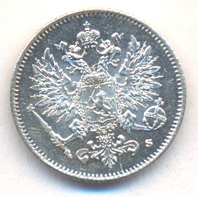 Лицевая сторона — российский двуглавый орел с гербом Великого княжества Финляндского на груди, оборотная — номинал и дата в венке из дубовых листьев. Проба — 750, нормативный вес — 1,27 грамма, гурт рубчатый.