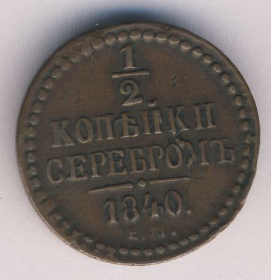 На новых монетах равенство серебряному курсу указано прямо в номинале: «1/2 КОПЕЙКИ СЕРЕБРОМ». Указ об их выпуске следует 6 сентября 1840 года («О новой медной монете на серебро 16-рублевого в пуде достоинства»). Массовая чеканка началось за год до этого на Екатеринбургском (знак ЕМ) и Сузунском (знак СМ) дворах. В качестве временной меры в 1840-1843 годах к ним подключается Ижорский завод (знак СПМ). С 1844 года после «значительного скопления медной монеты в народном обращении» в Екатеринбурге производство прекращается, а в Сузуне сокращается. Варшавский двор (знак MW), получив разрешение на выпуск общегосударственной монеты, успел отчеканить ее лишь в небольшом количестве в 1848 году.