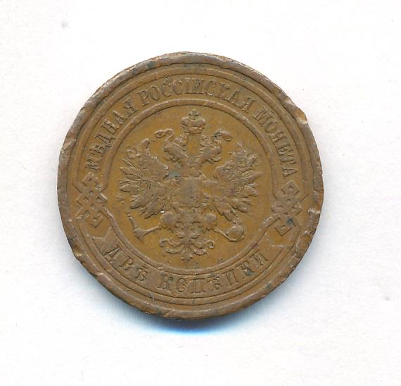 Лицевая сторона — двуглавый орел, надпись МЕДНАЯ РОССIЙСКАЯ МОНЕТА и обозначение номинала (две копейки); оборотная — обозначение номинала (2 копейки) в бусовом ободке и дата. Нормативный вес — 6,55 грамма, гурт рубчатый.
