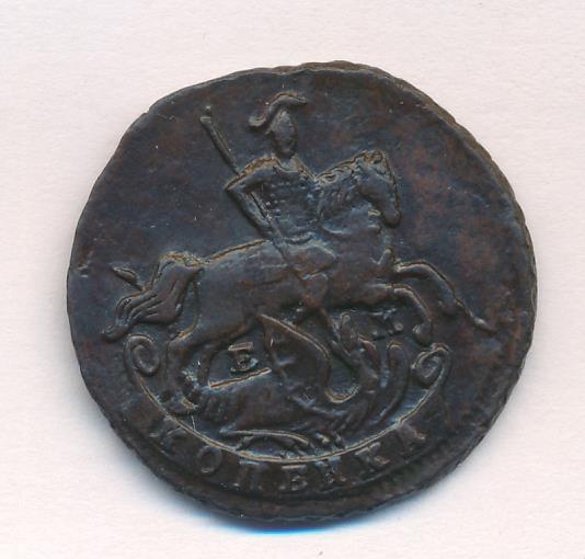 Лицевая сторона — Георгий Победоносец и обозначение номинала (копейка) в картуше, оборотная — вензель Екатерины II и дата. Нормативный вес — 10,24 грамма, гурт — сетка, или узор, или шнур.