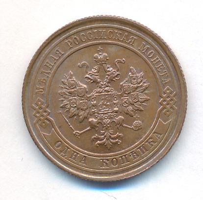 Лицевая сторона — двуглавый орел, надпись МЕДНАЯ РОССIЙСКАЯ МОНЕТА и обозначение номинала (одна копейка); оборотная — обозначение номинала (1 копейка) в бусовом ободке и дата. Нормативный вес — 3,28 грамма, гурт рубчатый.