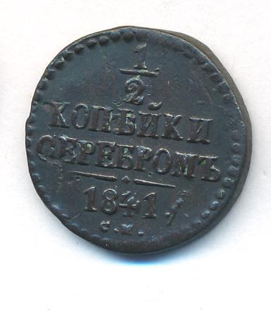 На новых монетах равенство серебряному курсу указано прямо в номинале: «1/2 КОПЕЙКИ СЕРЕБРОМ». Указ об их выпуске следует 6 сентября 1840 года («О новой медной монете на серебро 16-рублевого в пуде достоинства»). Массовая чеканка началось за год до этого на Екатеринбургском (знак ЕМ) и Сузунском (знак СМ) дворах. В качестве временной меры в 1840-1843 годах к ним подключается Ижорский завод (знак СПМ). С 1844 года после «значительного скопления медной монеты в народном обращении» в Екатеринбурге производство прекращается, а в Сузуне сокращается. Варшавский двор (знак MW), получив разрешение на выпуск общегосударственной монеты, успел отчеканить ее лишь в небольшом количестве в 1848 году.