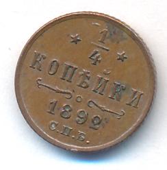Лицевая сторона — вензель Александра II в венке из лавровой и дубовой ветвей; оборотная — обозначение номинала (1/4 копейки) и дата. Нормативный вес — 0,82 грамма, гурт рубчатый.