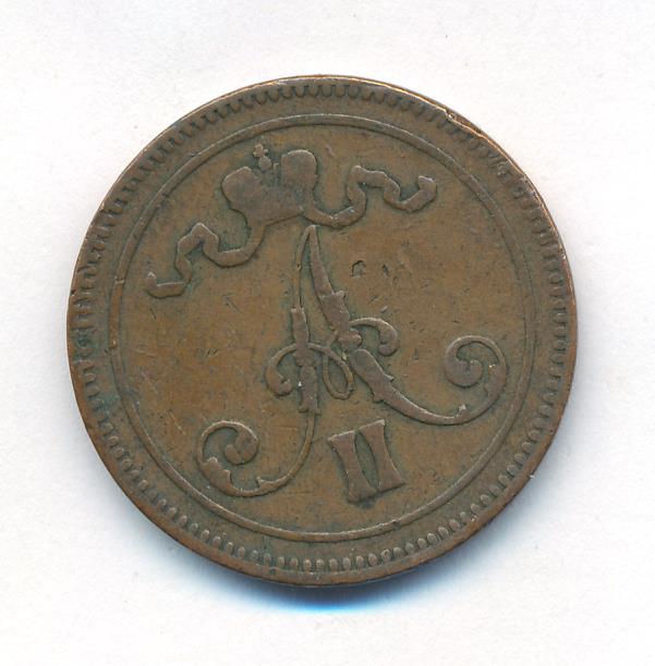 Лицевая сторона — вензель Александра II, оборотная — номинал (10 PENNIA) в венке из дубовых ветвей и дата. Нормативный вес — 12,80 грамма, гурт гладкий.