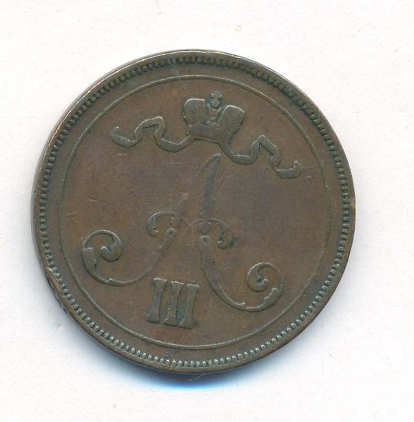 Лицевая сторона — вензель Александра II, оборотная — номинал (10 PENNIA) в венке из дубовых ветвей и дата. Нормативный вес — 12,80 грамма, гурт гладкий.