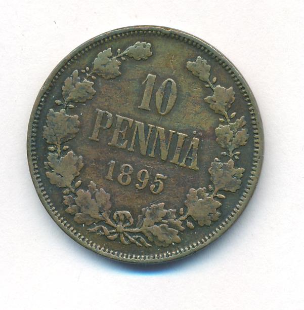 Лицевая сторона — вензель Александра II, оборотная — номинал (10 PENNIA) в венке из дубовых ветвей и дата. Нормативный вес — 12,80 грамма, гурт гладкий.