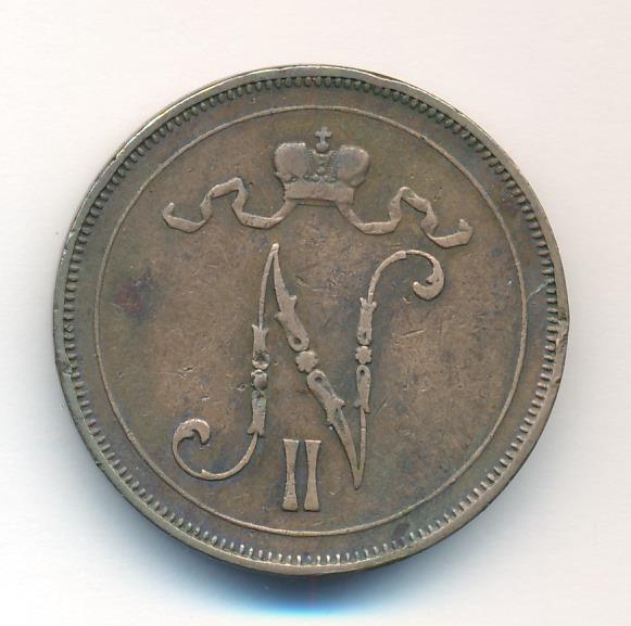 Лицевая сторона — вензель Александра II, оборотная — номинал (10 PENNIA) в венке из дубовых ветвей и дата. Нормативный вес — 12,80 грамма, гурт гладкий.