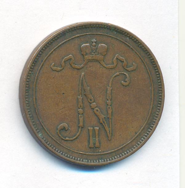 Лицевая сторона — вензель Александра II, оборотная — номинал (10 PENNIA) в венке из дубовых ветвей и дата. Нормативный вес — 12,80 грамма, гурт гладкий.