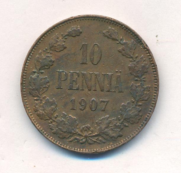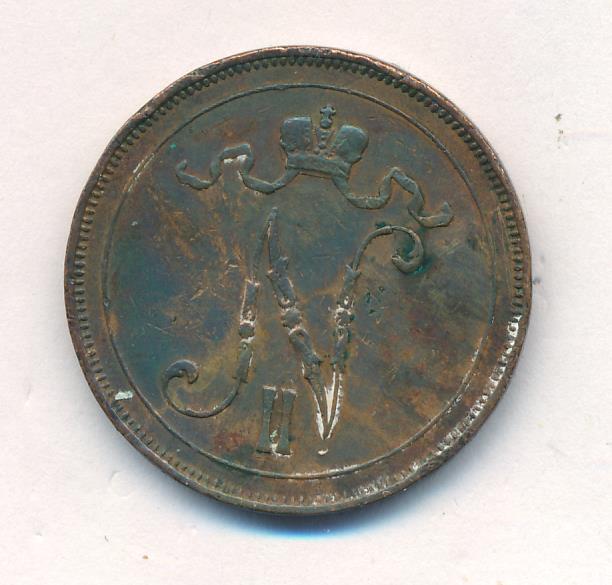 Лицевая сторона — вензель Александра II, оборотная — номинал (10 PENNIA) в венке из дубовых ветвей и дата. Нормативный вес — 12,80 грамма, гурт гладкий.