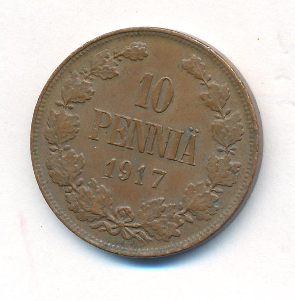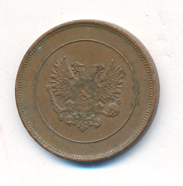 Лицевая сторона — вензель Александра II, оборотная — номинал (10 PENNIA) в венке из дубовых ветвей и дата. Нормативный вес — 12,80 грамма, гурт гладкий.