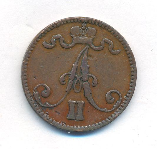 Лицевая сторона — вензель Александра II, оборотная — номинал (5 PENNIA) и дата. Нормативный вес — 6,40 грамма, гурт гладкий.