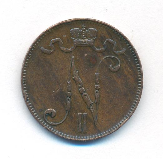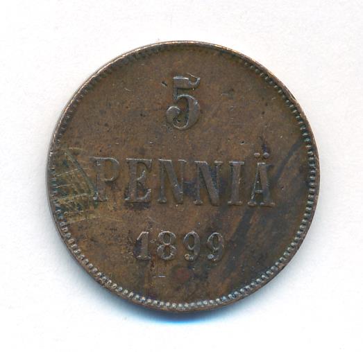 Лицевая сторона — вензель Александра II, оборотная — номинал (5 PENNIA) и дата. Нормативный вес — 6,40 грамма, гурт гладкий.