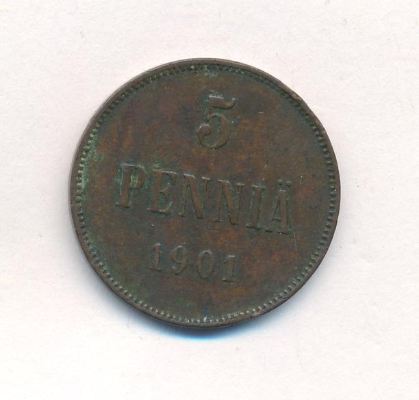 Лицевая сторона — вензель Александра II, оборотная — номинал (5 PENNIA) и дата. Нормативный вес — 6,40 грамма, гурт гладкий.