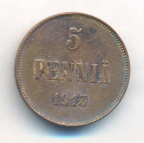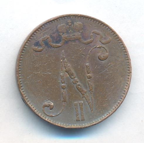 Лицевая сторона — вензель Александра II, оборотная — номинал (5 PENNIA) и дата. Нормативный вес — 6,40 грамма, гурт гладкий.