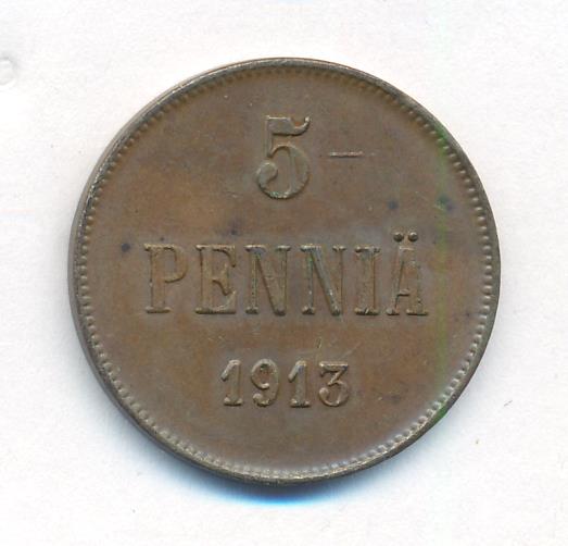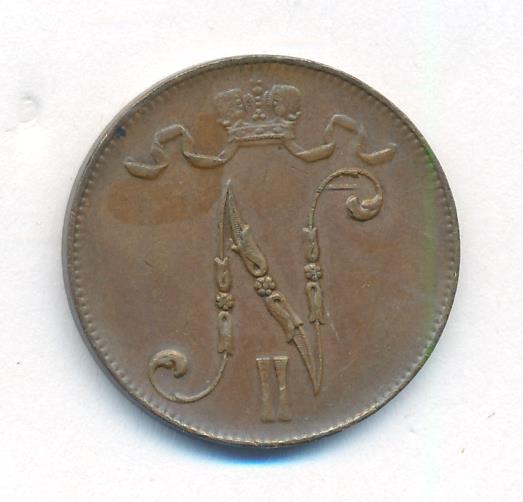 Лицевая сторона — вензель Александра II, оборотная — номинал (5 PENNIA) и дата. Нормативный вес — 6,40 грамма, гурт гладкий.
