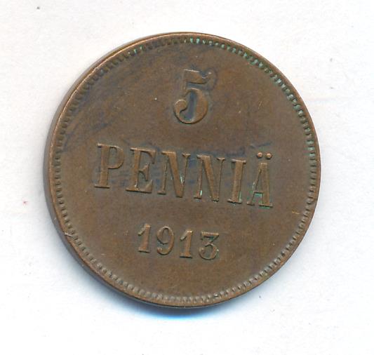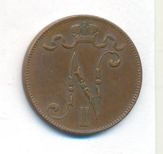 Лицевая сторона — вензель Александра II, оборотная — номинал (5 PENNIA) и дата. Нормативный вес — 6,40 грамма, гурт гладкий.