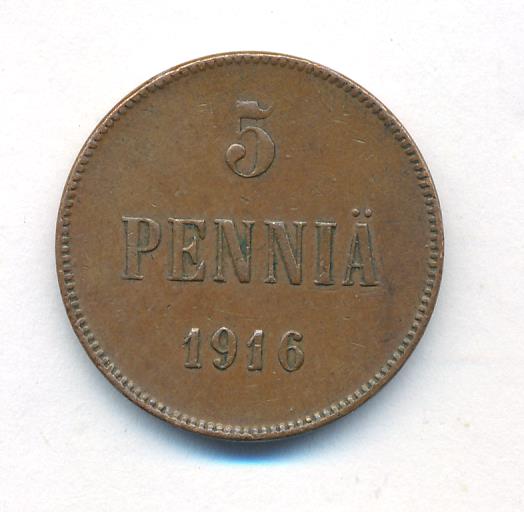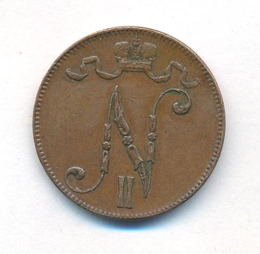 Лицевая сторона — вензель Александра II, оборотная — номинал (5 PENNIA) и дата. Нормативный вес — 6,40 грамма, гурт гладкий.