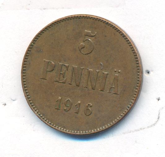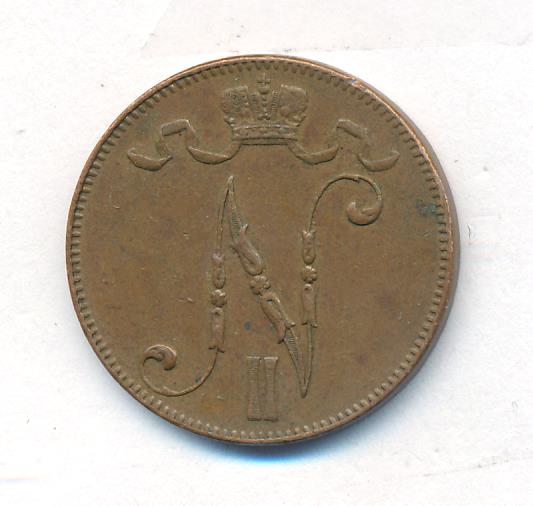 Лицевая сторона — вензель Александра II, оборотная — номинал (5 PENNIA) и дата. Нормативный вес — 6,40 грамма, гурт гладкий.