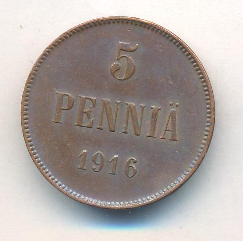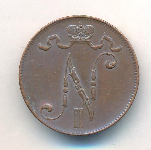 Лицевая сторона — вензель Александра II, оборотная — номинал (5 PENNIA) и дата. Нормативный вес — 6,40 грамма, гурт гладкий.