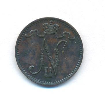 Лицевая сторона — вензель Александра II, оборотная — номинал (1 PENNIA) и дата. Нормативный вес — 1,28 грамма, гурт гладкий.