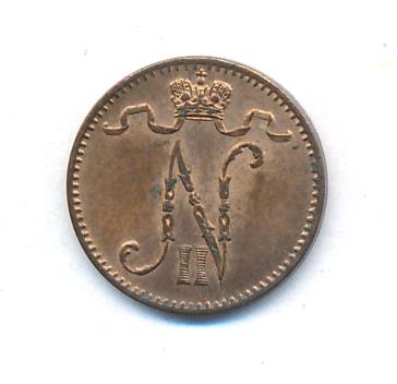 Лицевая сторона — вензель Александра II, оборотная — номинал (1 PENNIA) и дата. Нормативный вес — 1,28 грамма, гурт гладкий.