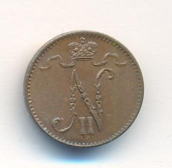 Лицевая сторона — вензель Александра II, оборотная — номинал (1 PENNIA) и дата. Нормативный вес — 1,28 грамма, гурт гладкий.